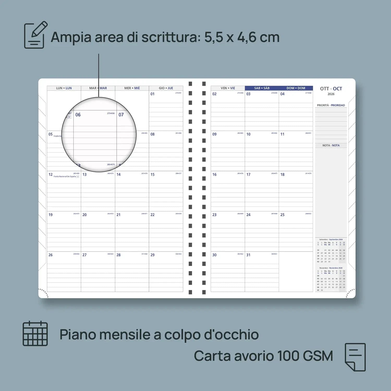 Monthly overview pages with a dedicated notes section help you see the bigger picture and set clear goals.