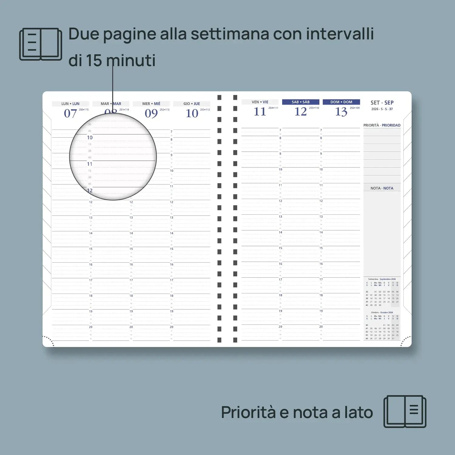 Week-to-view layout across 2 pages with 15-minute appointment intervals – ideal for managing meetings, lessons, or daily routines.