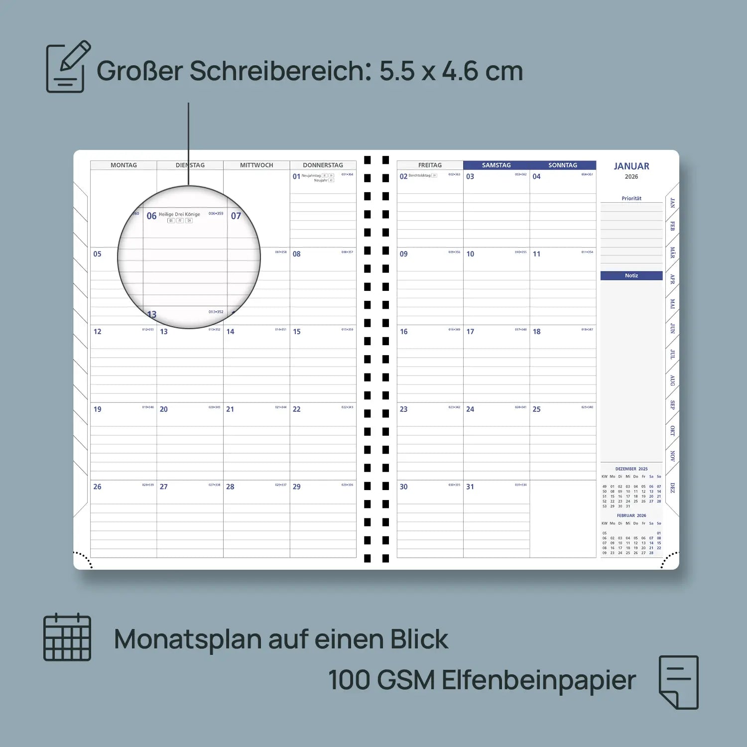 Monthly overview pages with a dedicated notes section help you see the bigger picture and set clear goals.