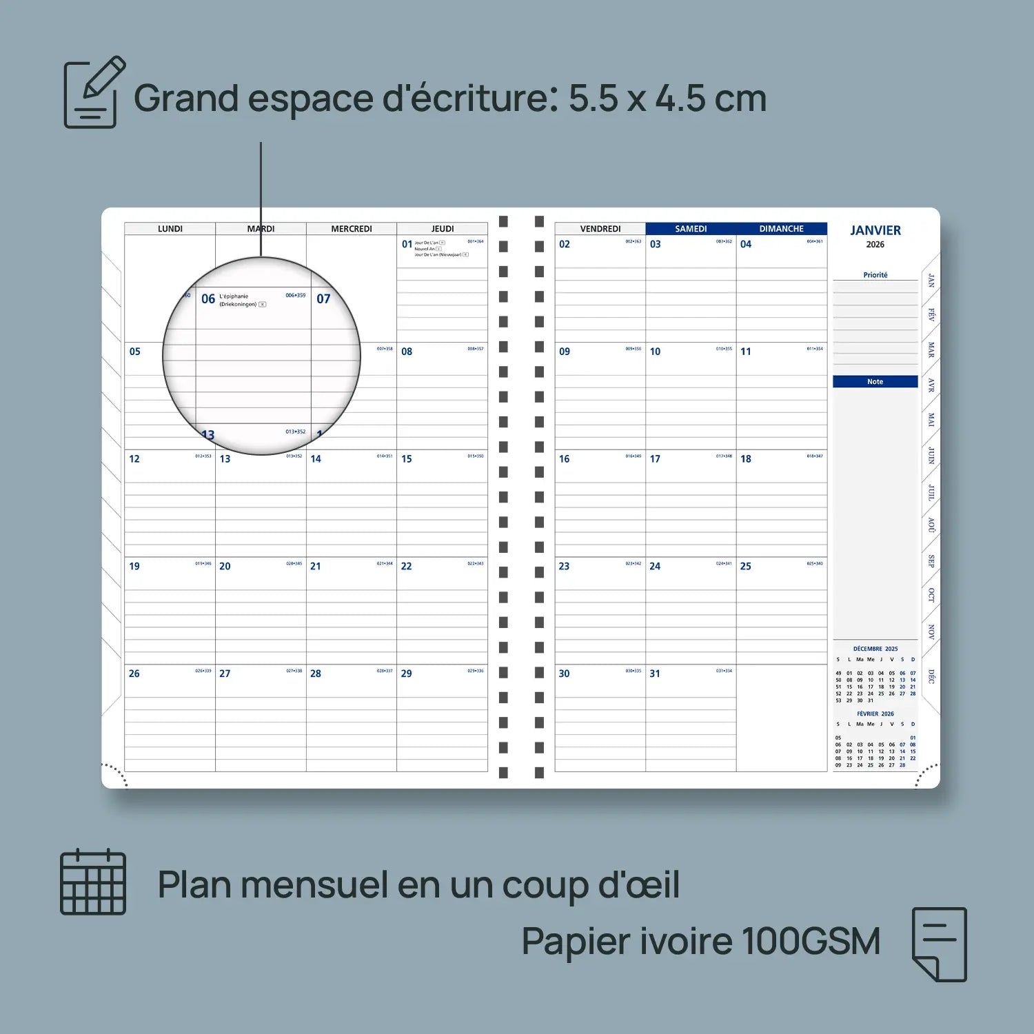 Monthly overview pages with a dedicated notes section help you see the bigger picture and set clear goals.