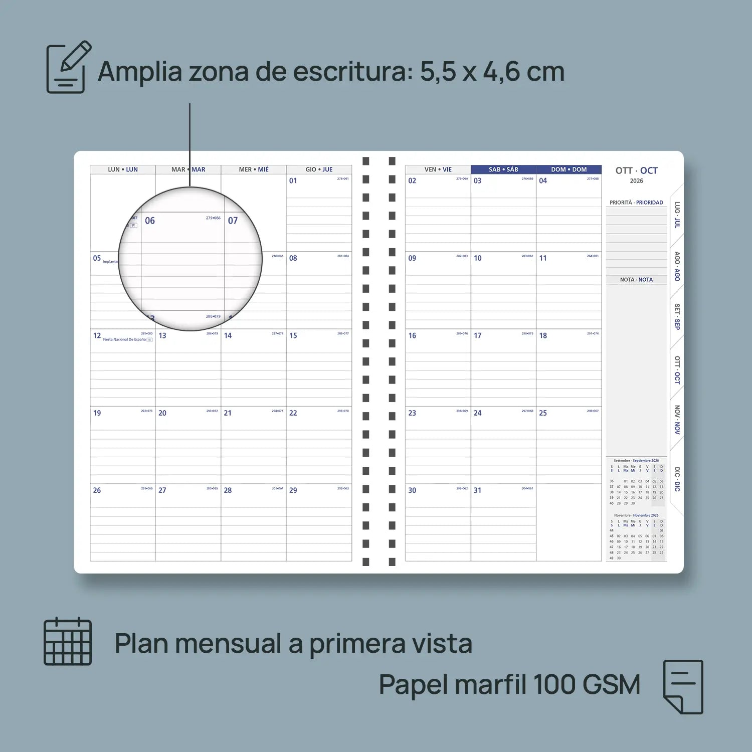 Monthly overview pages with a dedicated notes section help you see the bigger picture and set clear goals.