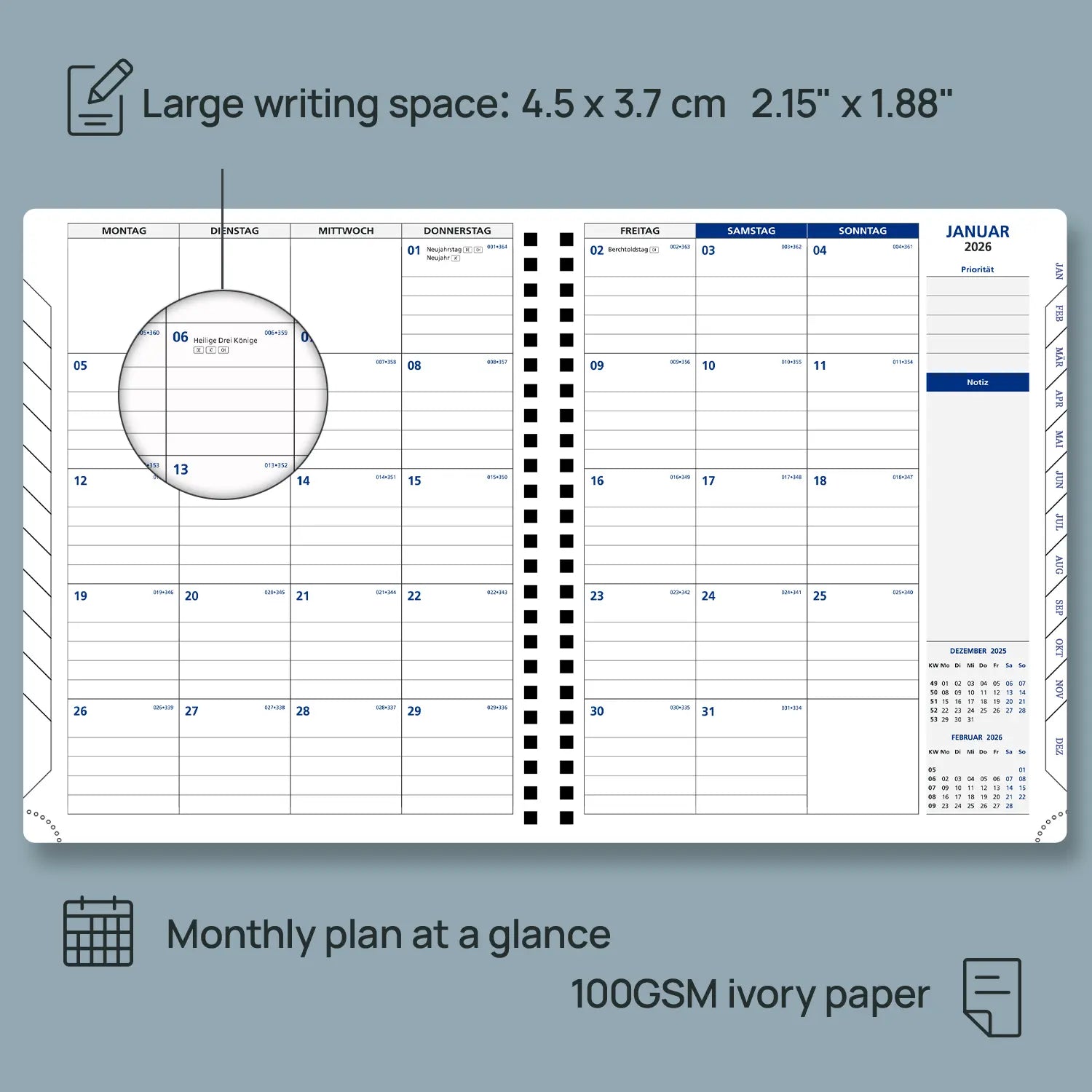 Monthly overview pages with a dedicated notes section help you see the bigger picture and set clear goals.
