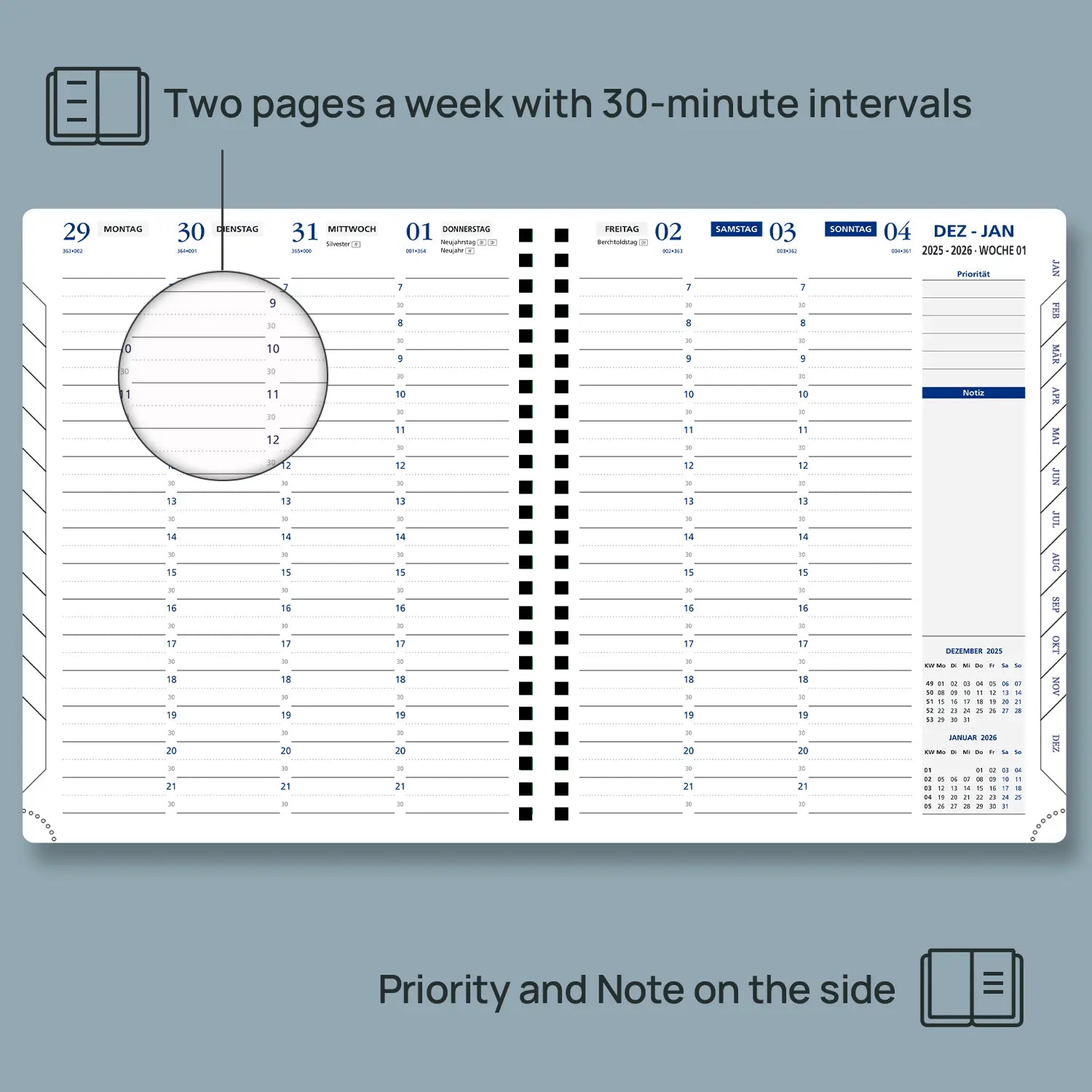 German A5 Weekly Planner 2026 30-minute intervals Softcover Appointment Book
